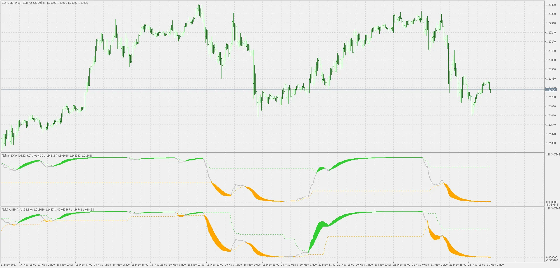 - नीचे की तुलना 'सामान्य' डीएसएल आरएसआई औसत (ऊपर) और बिना एंकर वाले डीएसएल आरएसआई औसत (नीचे) के बीच दिखाती है। जैसा कि स्पष्ट है, बिना एंकर वाला संकेतक संभावित ट्रेंड परिवर्तन को 'तेजी' से पहचानता है।