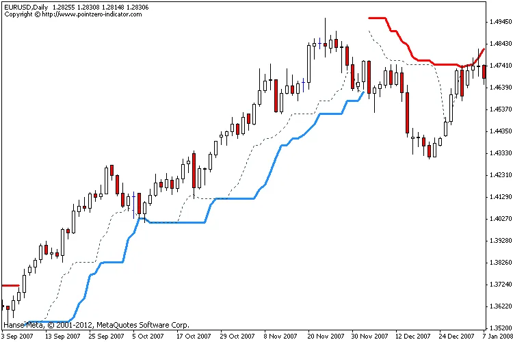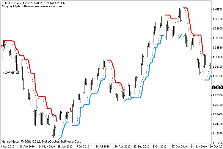 ในตัวชี้วัดนี้ เส้นสีแดงและสีน้ำเงินคือเส้นการเทรด และเส้นประคือเส้นออกจากการเทรด ระบบดั้งเดิมคือ: