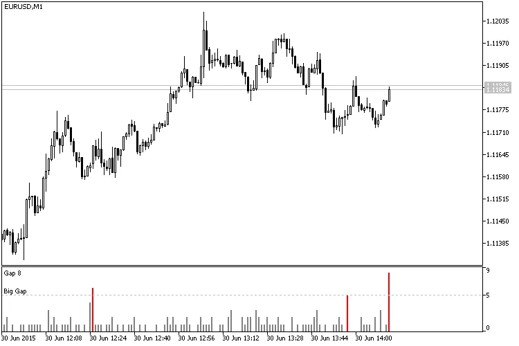 更有意思的是,这个指标还提供了根据缺口大小进行过滤的功能。如果你为 inpBigGap 参数设置一个正值,大于这个值的缺口将会在子窗口中显示为BigGap线,所有低于这一线的缺口会被标记为灰色,方便我们更清晰地识别。