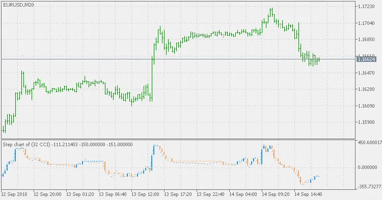 本版本采用步进图作为过滤工具,以减少CCI所产生的信号数量,同时(如果可能的话)使其使用起来更加简单和安全。您需要输入步进大小,单位为CCI,以作为过滤器,定义什么样的CCI变化被视为显著变化。
