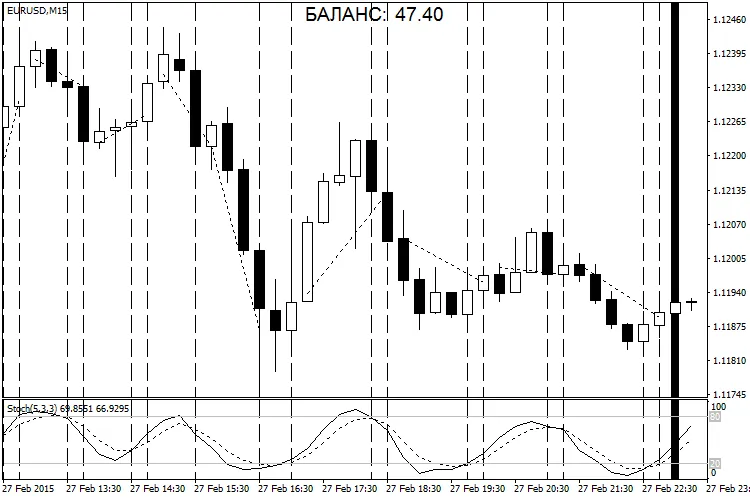 要在其他时间框架上绘图,请禁用订单处理(Trading=false)。只保留竖线作为信号时刻。通过按“Р”(Record)键,绘图结果将写入“EURUSD.60 2015.07.06-2015.07.06.tpl”文件。可以在不同的时间框架上使用此绘图模板,通过更改指标组合并使用模板绘图,进行最终的盈利测试,启用订单处理(Trading=true)。