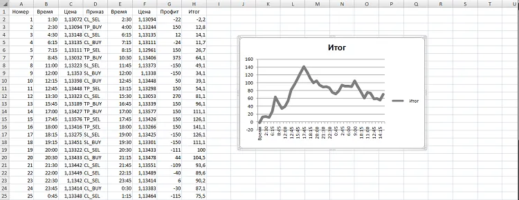 策略结果显示在余额表中,当检查结束后,按下“Р”(Record)键,结果将写入文件“EURUSD.60 2015.07.06-2015.07.06.xls”,该文件位于<terminal_data>\MQL4\Files\文件夹中。