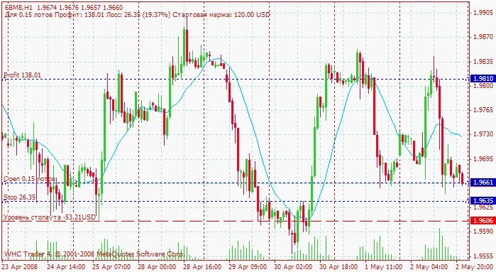 对于以欧元或英镑计算利润的品种(如FDAX、FTSE),你需要在市场观察窗口中显示EURUSD或GPBUSD的货币对,这样可以自动获取相应的外汇汇率。同样,对于任何交叉货币对XXXYYY,也必须在市场观察窗口中打开相应的基本货币对USDYYY(例如,对于GPBJPY,需打开USDJPY)。一旦你在必要的水平上设置了止损和止盈线,指标会自动在图表的左上角显示相应的利润(以美元计)和亏损,同时也会显示所需手数的保证金。