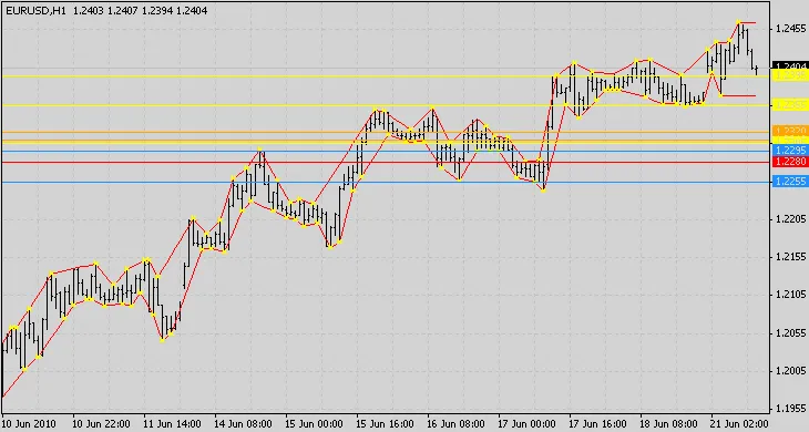 - PipRange:如果价格在x个点的范围内,则使用相同的计数器。例如,如果PipRange为10,则价格EUR/USD的1.2000和1.2010会使用相同的计数器。如果PipRange为1,则可能会有10条线之间。