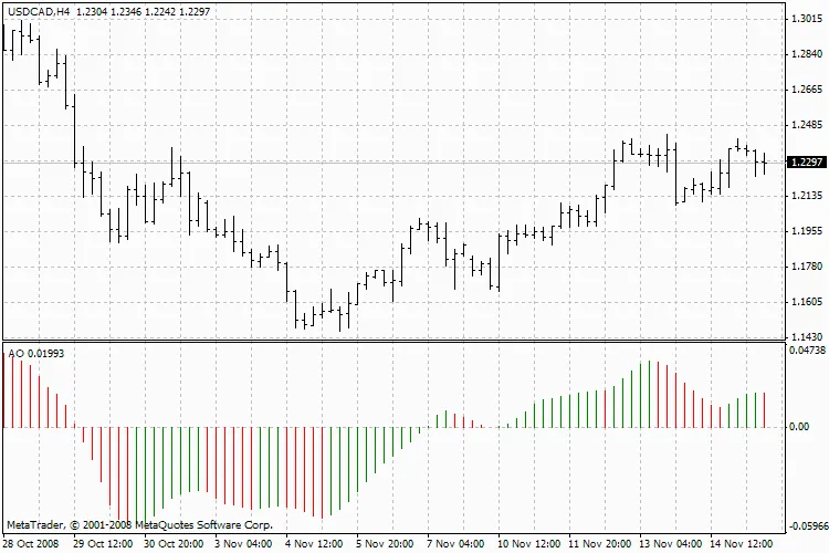 AO是基于34期简单移动平均线,通过柱子的中点(高+低)/2绘制而成,并从5期简单移动平均线中减去,这5期平均线同样基于柱子的中点(高+低)/2。