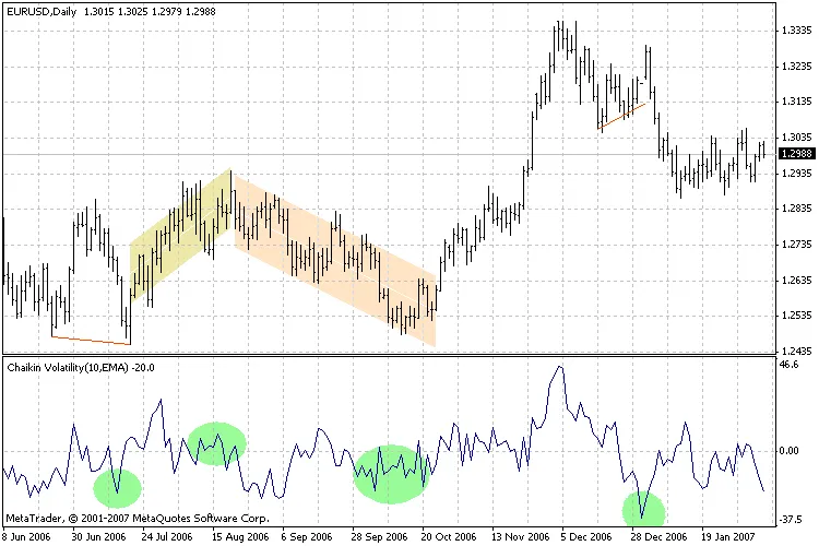 根据Chaikin的波动率解读方法,波动率指标值的短期上升通常意味着价格即将接近一个底部。例如,当我们看到证券出现恐慌性抛售时,波动率的快速上升常常是一个信号。
