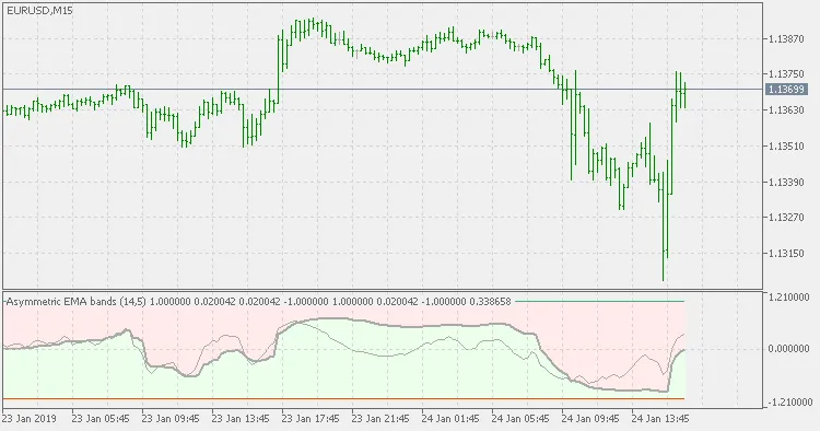这是一款扩展版的“常规”非对称带振荡器(原文发布于这里:非对称带振荡器)。此版本增加了对当前趋势中价格“权重”的估算,并尝试评估其对趋势形成的影响。