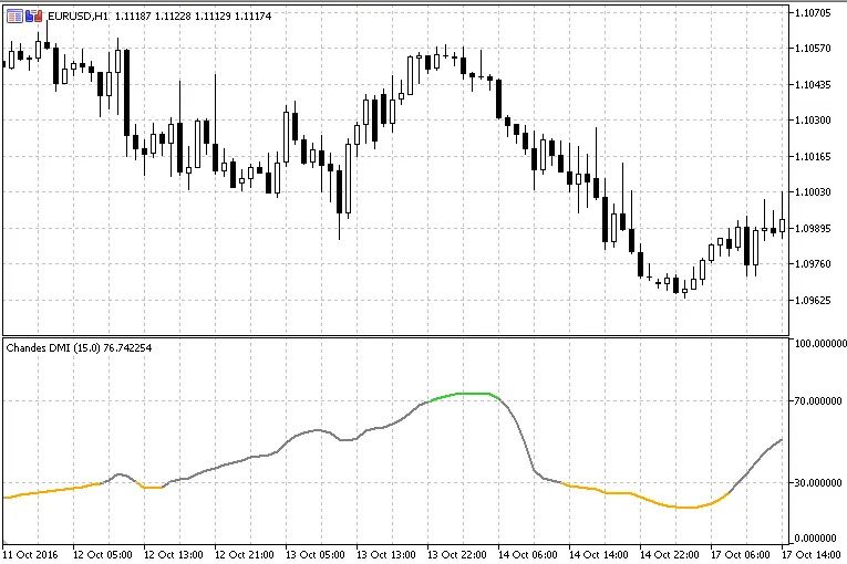 이 지표는 RSI와 같은 방식으로 해석됩니다. 즉, 30 이하의 수치는 과매도, 70 이상의 수치는 과매수로 간주됩니다. 다이나믹 모멘텀 지수는 기초 자산의 변동성이 증가함에 따라 사용되는 기간 수가 감소하므로, 가격 변화에 대한 반응이 RSI보다 더 민감합니다.
