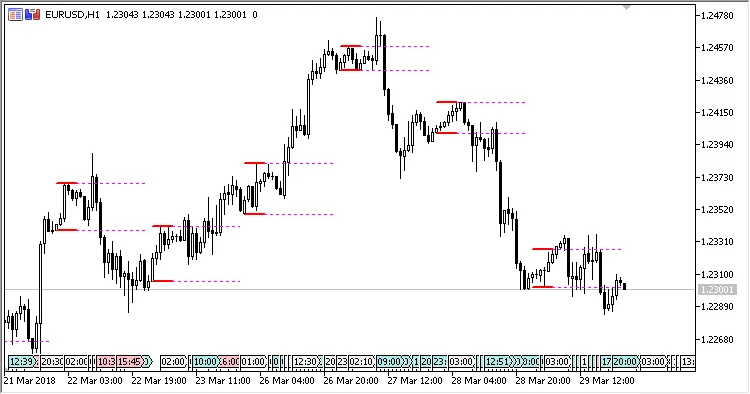 브레이크아웃 지표는 특정 시간 간격 동안 차트에 고점과 저점 수준을 표시합니다. 이 시간 간격은 시작과 종료의 시간과 분으로 설정할 수 있습니다.