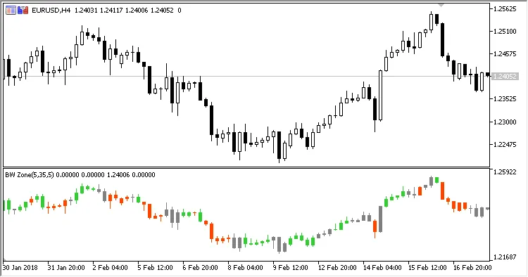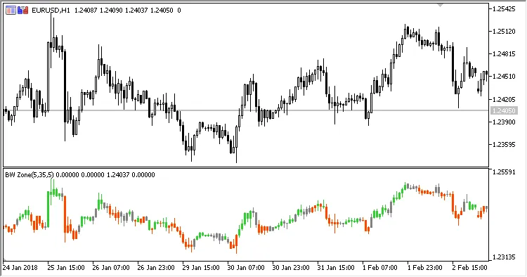このインジケーターは、別のウィンドウにキャンドルスティックチャートとして描画され、ゾーンに応じて色分けされます: