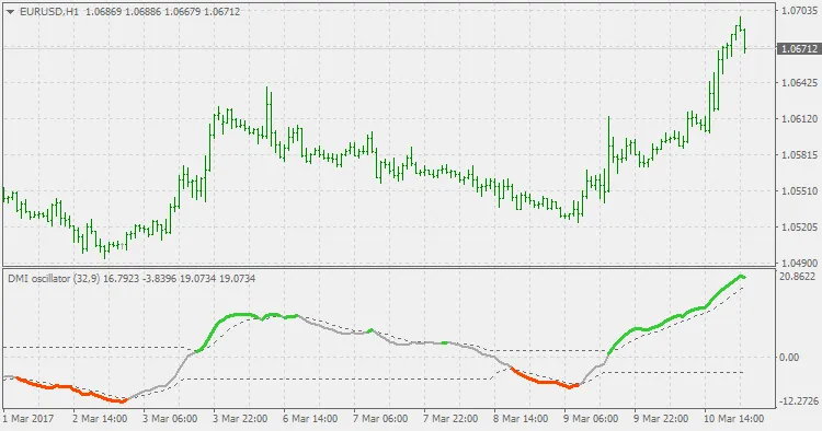 DSL 지표군의 모든 지표와 마찬가지로, 이 오실레이터는 추세 거래와 반추세 거래 모두에 사용할 수 있지만, 이 경우 DMI는 모멘텀 강도 추정에도 기여할 수 있습니다.
