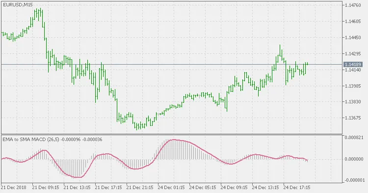 Questa idea deriva da un'altra piattaforma di trading. Anche lì lo chiamavano in modo diverso, ma il nome che usiamo qui descrive perfettamente di cosa si tratta. La concezione è semplice: contiamo sul fatto che l'EMA (Media Mobile Esponenziale) sia "più veloce" rispetto alla SMA (Media Mobile Semplice). In questo modo si costruisce un "MACD" utilizzando un singolo periodo (a differenza del "classico" MACD che richiede medie per periodi veloci e lenti per i calcoli). La linea del segnale in questo caso è calcolata come una SMA.