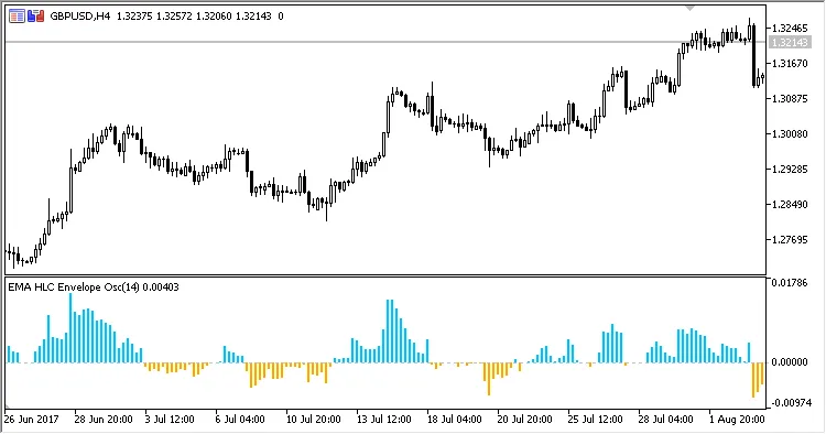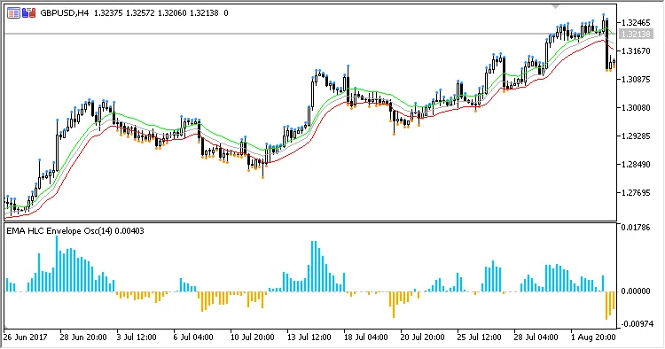 ヒストグラムは、クローズ価格が EMA HLC エンベロープの上部エンベロープを突破した場合に正の値を持ち、クローズ価格と上部エンベロープとの距離を表示します。