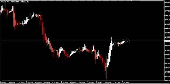 यह Heiken Ashi का मानक संस्करण है, लेकिन इसमें Doji को पहचानने और उन्हें अलग रंग में दिखाने का विकल्प है।