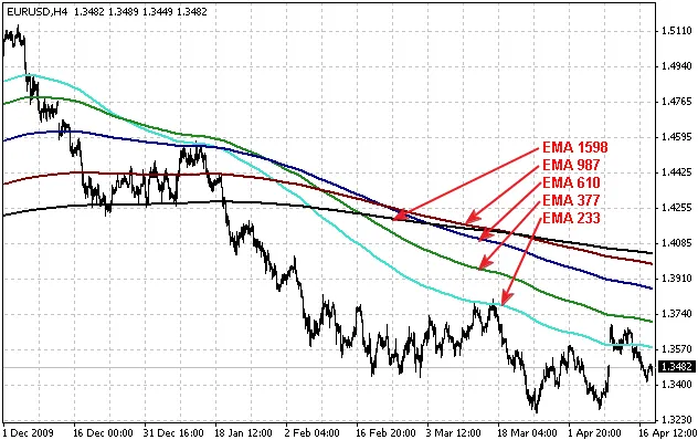 Este indicador utiliza EMAs (Medias Móviles Exponenciales) basadas en los números de Fibonacci, lo que puede ser muy útil para los traders que buscan identificar tendencias y niveles clave en el mercado.