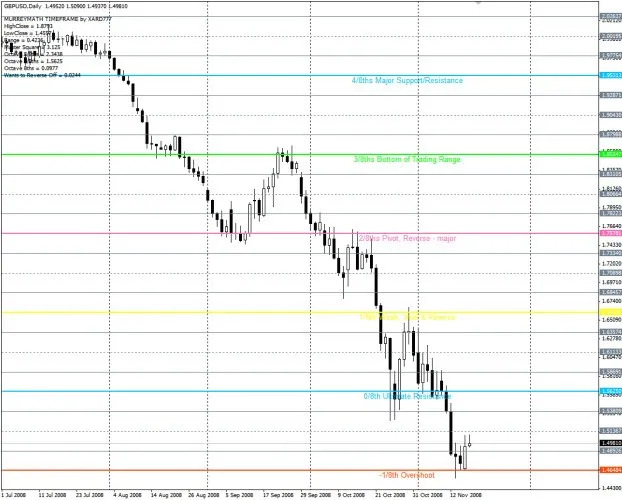 • 4/8 Línea (Soporte/Resistencia Principal): Esta línea proporciona la mayor cantidad de soporte y resistencia. Tiene el mayor soporte cuando los precios están por encima de ella y la mayor resistencia cuando están por debajo. Este nivel de precio es el mejor para comprar y vender.