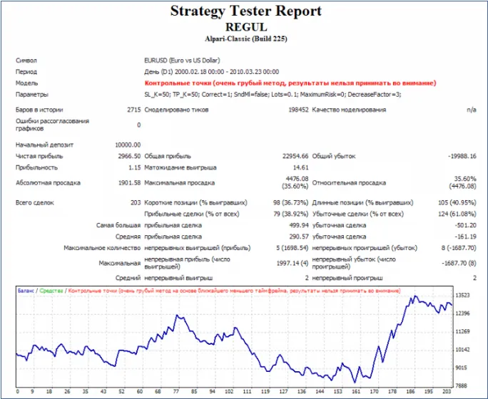 Ini adalah pengujian yang tidak dioptimalkan, transaksi dilakukan saat pembukaan bar, jadi tidak perlu diuji "setiap tick", mode transaksi 1 pada bar. Timeframe: Harian, instrumen: EURUSD, periode: semua yang tersedia antara 1999 hingga 2010. Stop Loss dan Profit pada level 500 poin. Penarikan dilakukan berdasarkan kondisi transaksi berlawanan.