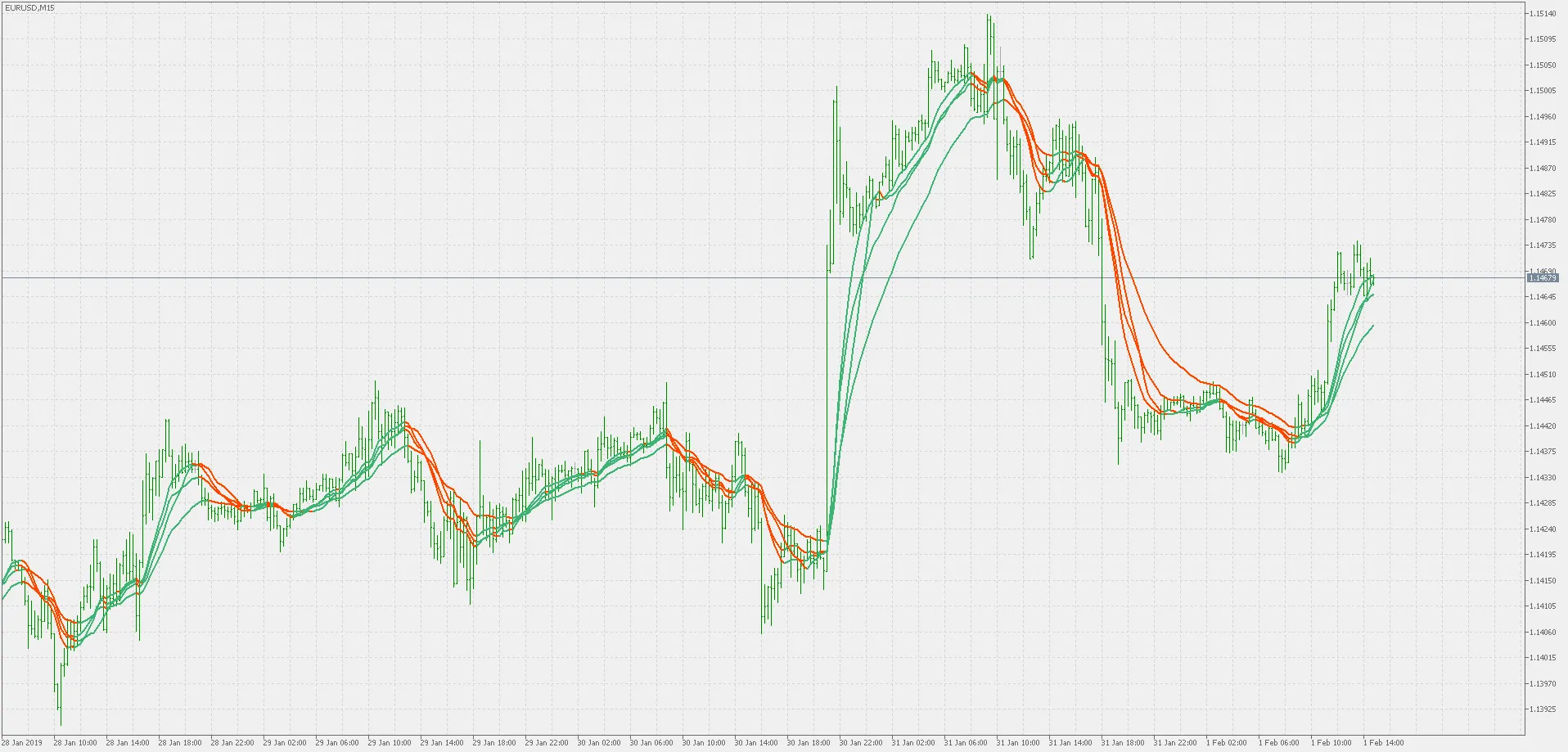 Ia boleh digunakan sama seperti purata lain. Perbezaan antara jenis-jenis ini boleh menjadi ketara (lihat contoh kedua di mana semua 4 jenis berada pada carta yang sama), jadi sedikit eksperimen adalah disarankan sebelum membuat keputusan perdagangan.
