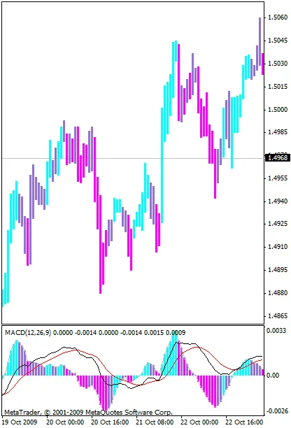 Linhas clássicas do MACD com OSMA preenchido no gráfico.