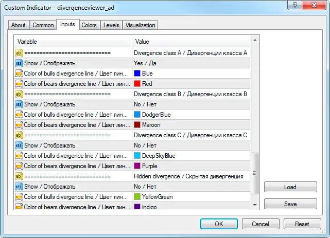 こんにちは、皆さん!今日は、MetaTrader 4で使えるダイバージェンス検出インジケーターについてお話しします。このインジケーターは、価格チャートとインジケーターチャートの2本のラインでダイバージェンスを表示します。これにより、4つのダイバージェンスのクラスを登録することが可能です。それぞれのダイバージェンスクラスには、登録の必要性を示すスイッチと、ブルとベアのダイバージェンスラインの色を選択するオプションがあります。