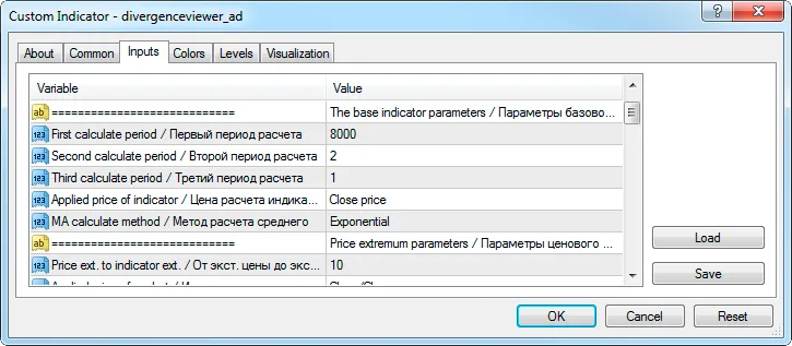 ベースインジケーターの設定が完了したら、「2番目のサポートポイントの深さ」を入力してダイバージェンスの最大長を決定し、「価格のエクストリームからインジケーターのエクストリームまで」のパラメーターで価格のエクストリームとインジケーターのエクストリームの一致度を定義する必要があります。