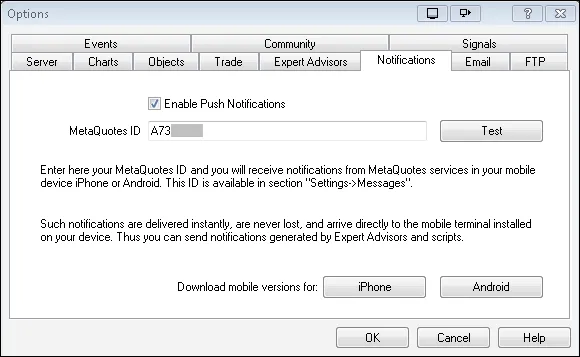 - MetaQuotes ID को MT4 के क्लाइंट टर्मिनल में दर्ज करें (Tools → Options → Notifications)।