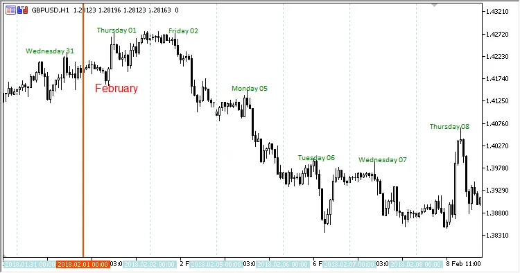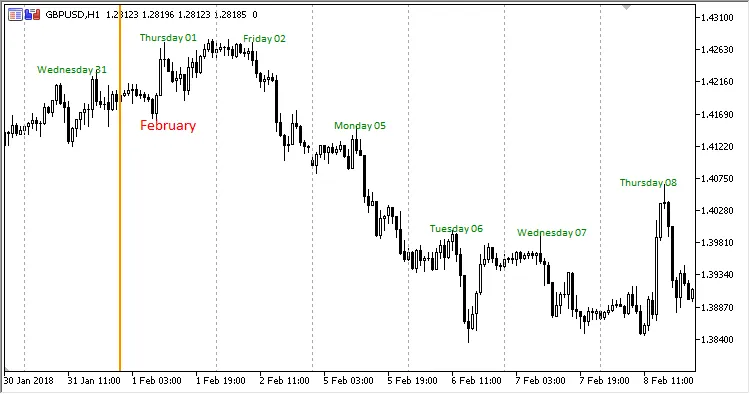 皆さん、こんにちは!今日は、MetaTrader 5で使える曜日表示インジケーターについてご紹介します。このインジケーターは、価格チャート上に曜日を表示する便利なツールです。曜日の名前、日付の数字、月の名前、そして曜日の区切り線を表示してくれます。