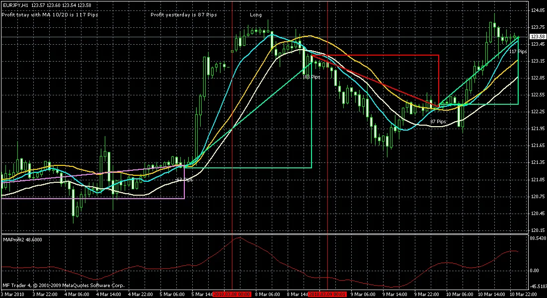 상단 라인에는 "MA 5/19로 오늘의 이익은 60핍"이라고 표시됩니다. 지표나 사용자가 빠른 MA에 5, 느린 MA에 19를 선택한 것입니다. 다음 텍스트 필드에는 어제의 결과와 롱 또는 숏 신호가 표시됩니다. 트레이더들은 차트에 두 개의 이동 평균을 추가하고 주어진 값으로 설정할 수 있습니다.