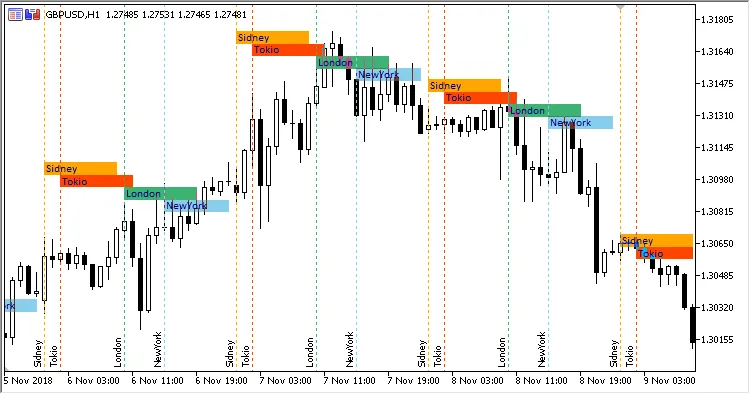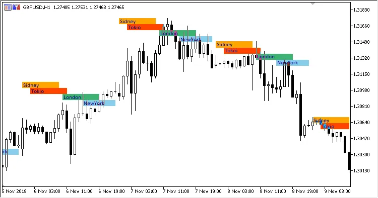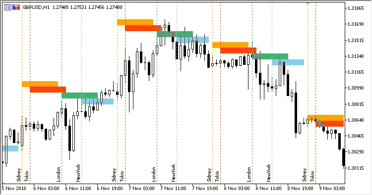 マーケットセッションインジケーターは、ニューヨーク、ロンドン、東京、シドニーの各トレーディングセッションを価格チャートに表示します。各トレーディングセッションの開始時刻と終了時刻は、手動で設定することができます。