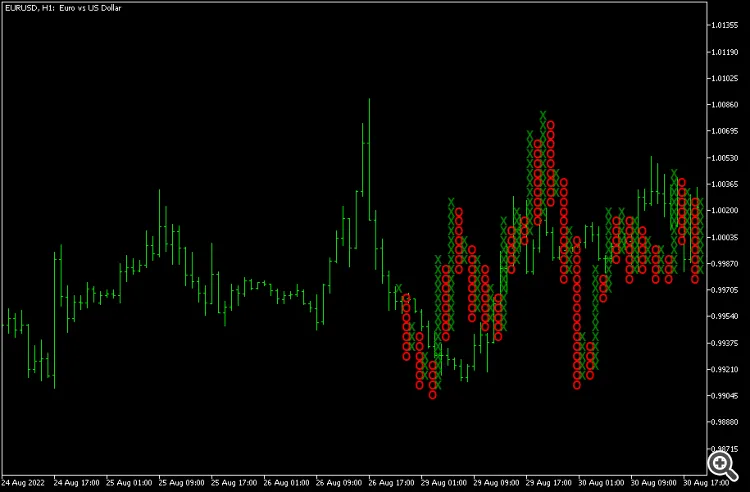 아래 예시 이미지는 포인트 앤 피규어 지표를 사용하여 4일간의 EUR/USD 가격 변동을 47개의 X와 O 열로 압축한 것입니다. 박스 크기는 60포인트(6핍)로 설정되어 있으며 반전은 3입니다.