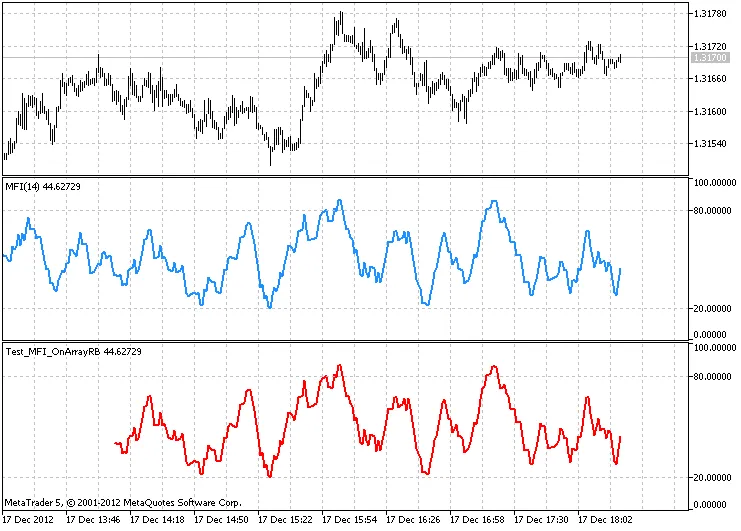 - Test_MFI_OnArrayRB.mq5ファイルでは、価格時系列に基づくインジケータの計算が示されています。MainOnArray()メソッドの使用例も見られます。