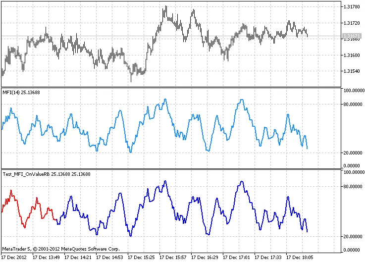 - Test_MFI_OnValueRB.mq5ファイルでは、MainOnValue()メソッドの使用例が示されています。最初にMFIインジケータが計算され、描画された後、そのリングバッファを基に別のMFIインジケータが描画されます。