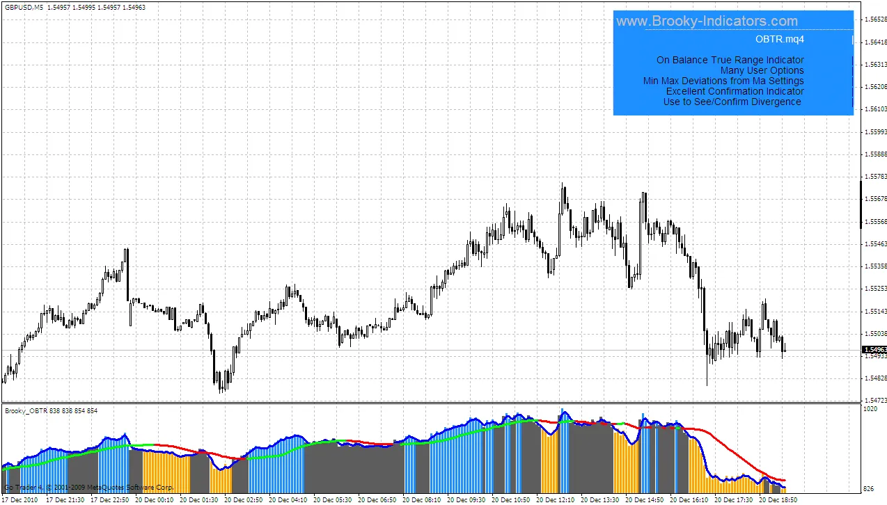 建议与 MACD 信号以及 OBTR 的 9 EMA 平滑线一起使用。设置中的接近参数可以让你决定 OBTR 线距离慢速移动平均线(MA)有多少点数的接近,才会出现交叉。如果设置为 11,这意味着会灰显 22 个点的范围,这可以作为突破点。设置较小的数值往往能显示出趋势回调的结束。最大设置旨在灰显那些 MA 和 OBTR 差异超过你所设定值的区域。例如,如果设置为 126 点,这可能是突破的疲软点,适合获利了结。