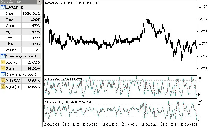 El Estocástico clásico posiciona el precio actual entre un precio máximo y un mínimo durante un número determinado de barras, definido por el valor %K (Kperiod), y no distingue la diferencia entre los extremos, por ejemplo, 1 punto o 100 puntos. En ambos casos, los resultados serán los mismos, y obtendremos las señales de sobrecompra/sobreventa.