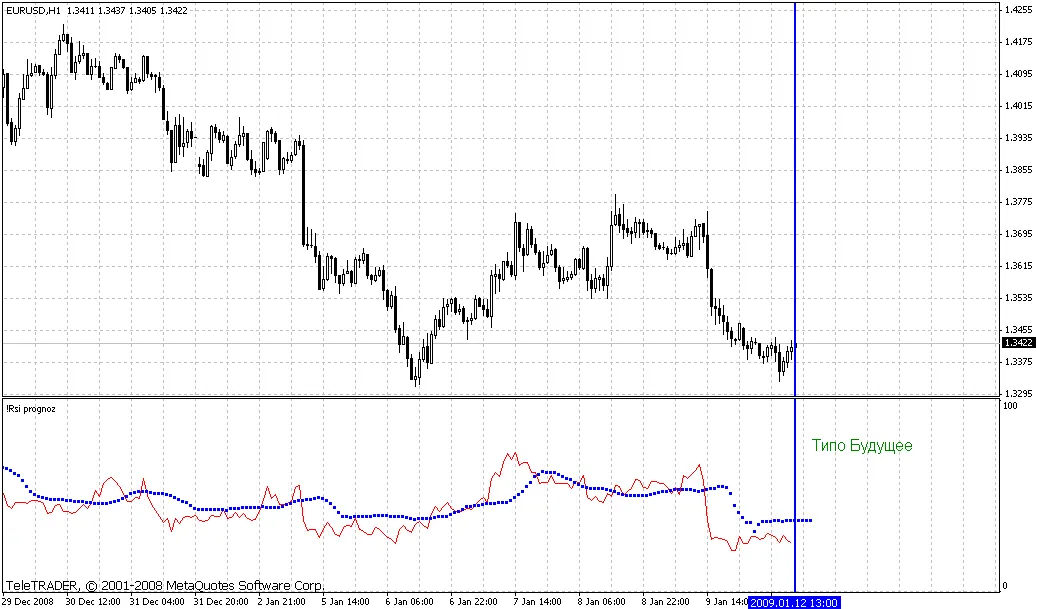 这个想法其实很简单:我们取过去 pr_period 根K线的 RSI 历史值,然后观察在 progn 根K线之后的指标值,也就是说,我们获取一组指标值和一个伪值来表示这一组的结果,并将其存储到数组中。接下来,我们在指定的搜索深度 glubina 上遍历这个数组,查看历史中是否有类似的情况(满足误差阈值的情况),并分析这些情况的结果。最后,使用 exp 方法对获得的结果进行平均,这样就完成了预测的计算。