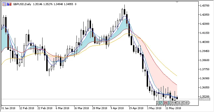 * SHORT: 5 LWMA dan 8 LWMA melintasi saluran EMA ke bawah.