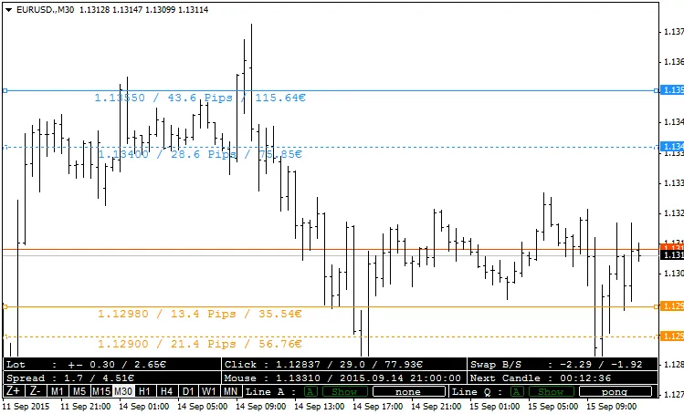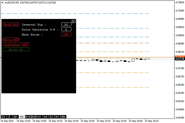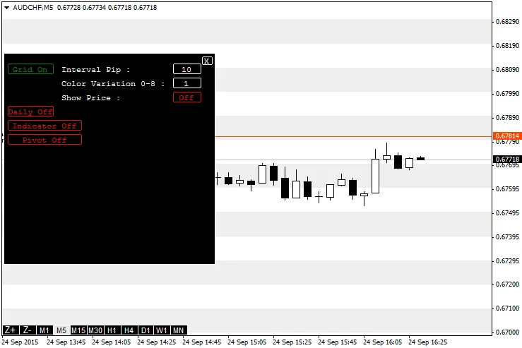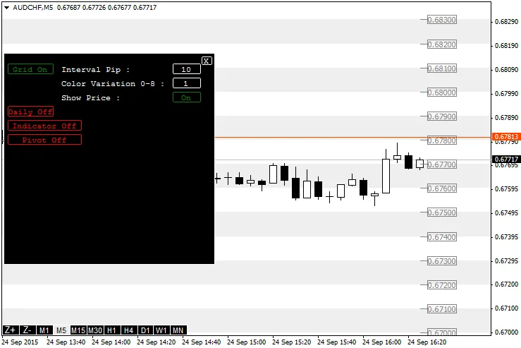 Description: A grid can be displayed in the chart background; you can choose the pip height, color intensity, and whether or not to show the price.