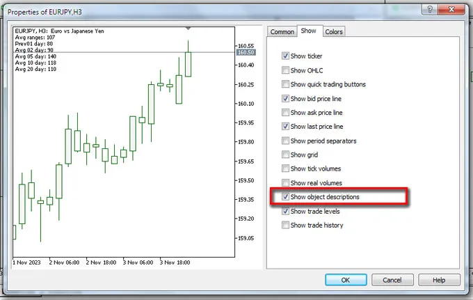 MT5 차트 속성에서 '객체 설명 표시' 옵션을 체크하는 것을 잊지 마세요.