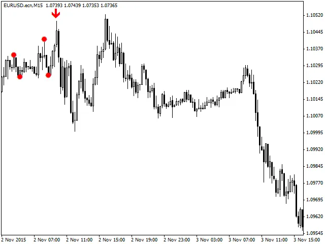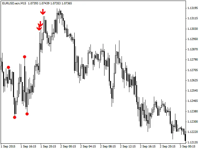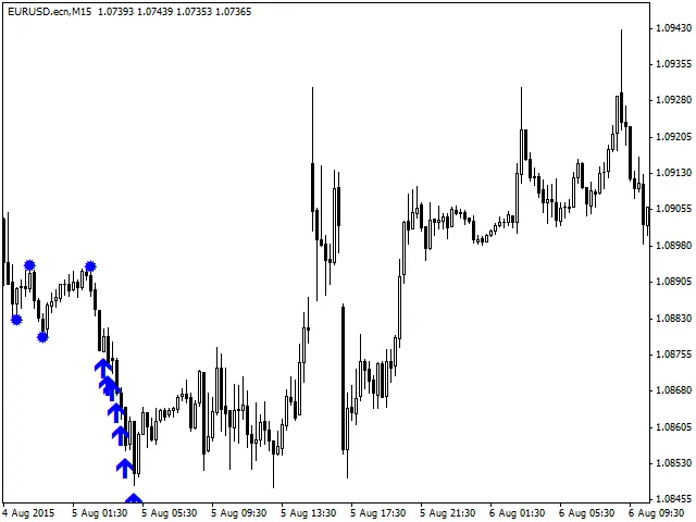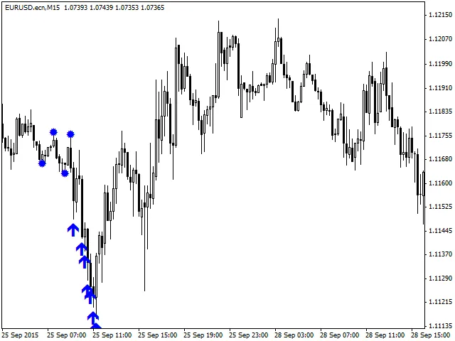 - Deze indicator werkt het beste op EURUSD M15 met de standaardinstellingen, maar andere tijdframes zijn ook mogelijk.