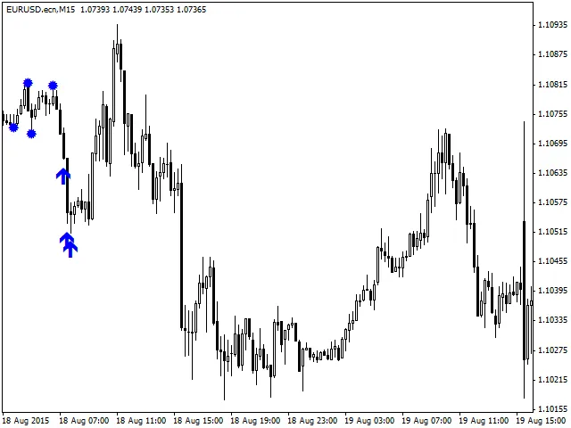 De afbeeldingen tonen de signalen die zijn geactiveerd, gesorteerd op tijd vanaf het moment van publicatie van de indicator. De EURUSD M15 is hiervoor gebruikt.