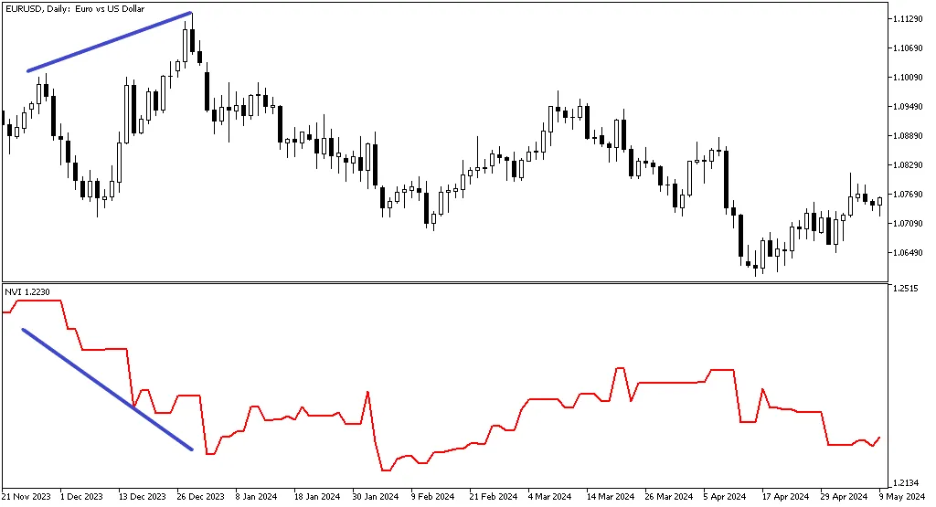 อีกทางเลือกหนึ่งคือการตรวจสอบการเบี่ยงเบนระหว่างราคากับดัชนีปริมาณเชิงลบเพื่อสังเกตการกลับตัวของแนวโน้ม ที่นี่กราฟราคาแสดงระดับสูงขึ้นใหม่ในขณะที่ NVI แสดงระดับต่ำลง: