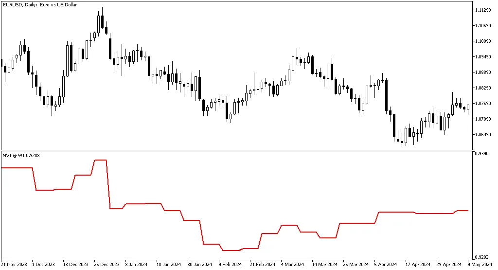 ดัชนีปริมาณเชิงลบ (NVI) เป็นดัชนีทางเทคนิคที่มีอายุเก่าแก่ซึ่งพัฒนาโดย Paul L. Dysart ในช่วงต้นศตวรรษที่ 20 และได้รับการปรับปรุงโดย Norman G. Fosback ในปี 1976 โดยประกอบด้วยเส้นออสซิลเลเตอร์เส้นเดียวในหน้าต่างดัชนีแยกต่างหาก เส้นนี้จะเพิ่มขึ้นหรือลดลงเฉพาะสำหรับแท่งที่มีปริมาณน้อยกว่าแท่งก่อนหน้า