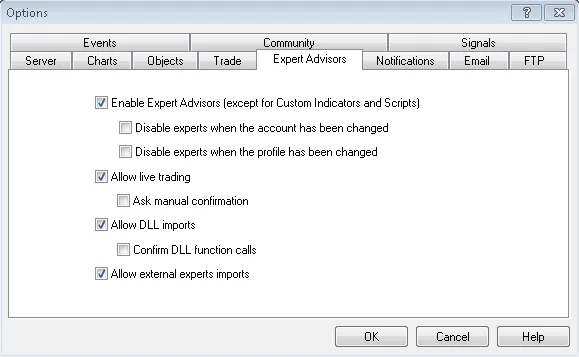 用户应检查专家顾问的设置。工具 → 选项 → 专家顾问
