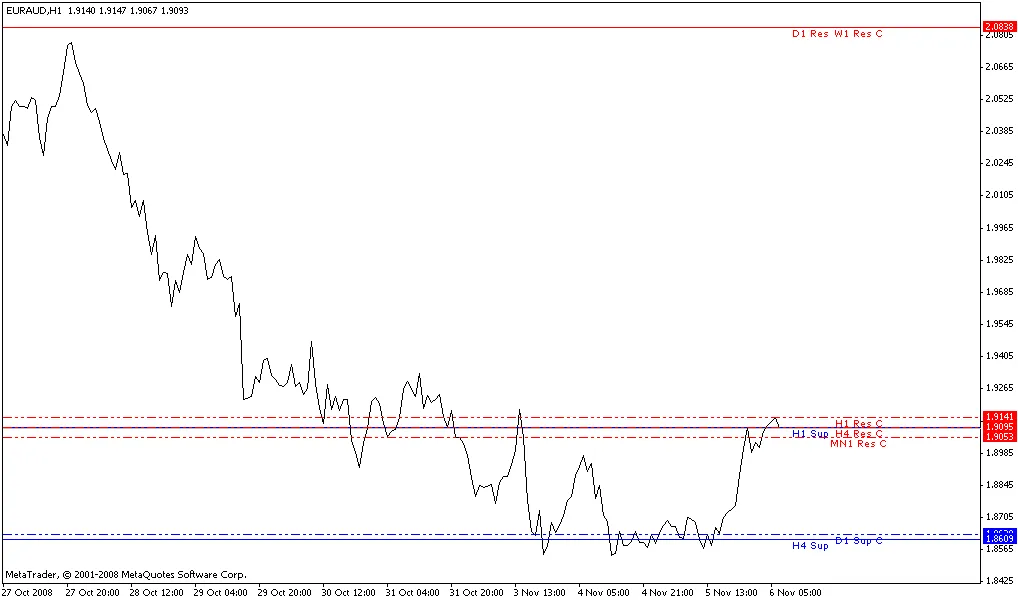 支撑与阻力水平:在图表中,蓝色线条代表支撑水平,而红色线条则是阻力水平。支撑水平是价格下跌时多头可能介入的区域,而阻力水平则是价格上涨时空头可能反击的地方。
