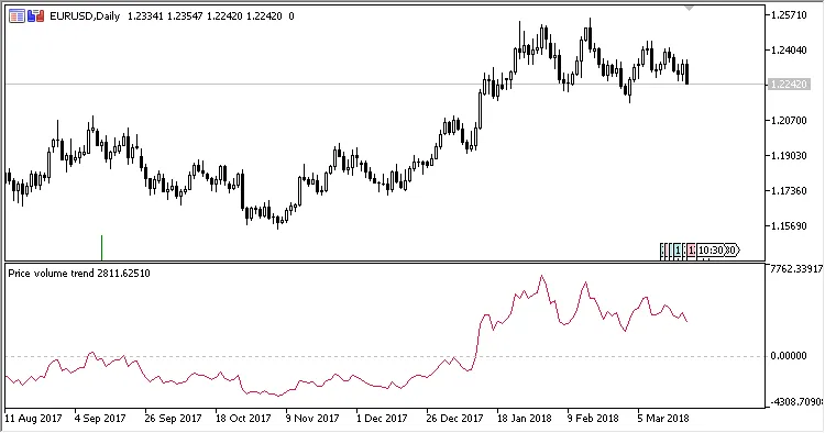 PVT = ((Close - Close(-1)) / Close(-1)) * TickVolume + PVT(-1)