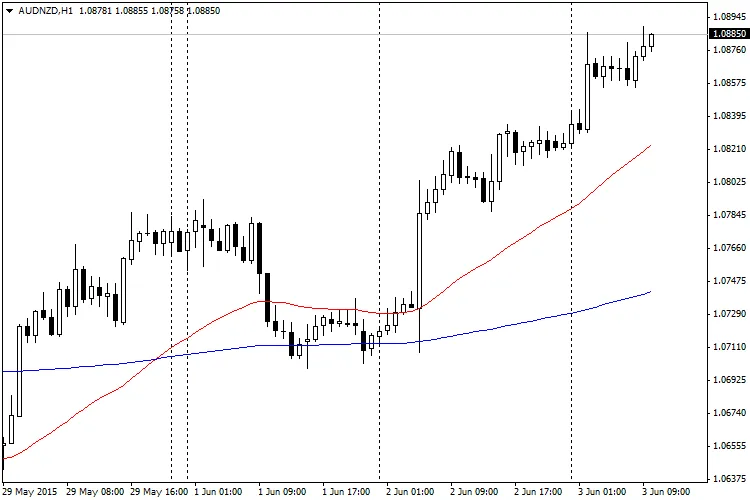 ご覧の通り、第3世代移動平均線(赤線)は、従来のEMA(青線)よりも若干遅延が少なく、価格の変化に対しても早く反応します。しかし、残念ながら、まだ遅延があり、誤ったシグナルを出すこともあります。このインジケーターは、従来の移動平均線と同様に、現在のトレンドの方向を把握するために使用できます。