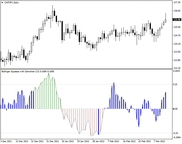 추가로, 볼린저 스퀴즈 고급은 메인 히스토그램에 내장된 변동성 측정을 제공합니다. 볼린저 스퀴즈가 횡보 시장을 나타내면(볼린저 밴드가 켈트너 채널 안에 위치할 때), 히스토그램 바는 두꺼운 파란색으로 변경됩니다.