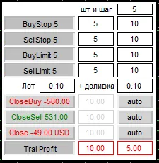 - FirstLevel — 가격에서 첫 번째 주문까지의 거리 (0으로 설정 시 스탑 레벨에서 열림). 패널의 오른쪽 상단에서 변경 가능.