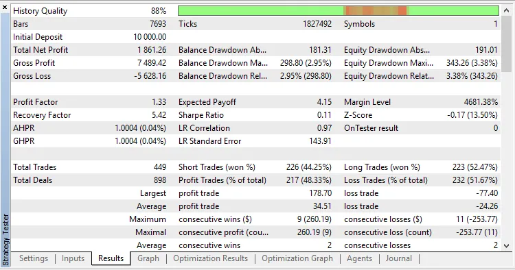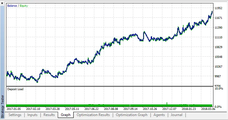 Per testare la strategia, sono state utilizzate le impostazioni predefinite con EURUSD H1 in modalità OHLC a 1 minuto, nel periodo dal 02 gennaio 2017 al 29 marzo 2018.