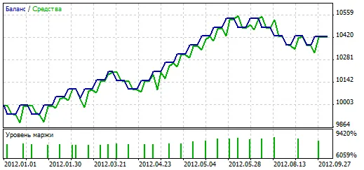 รูปที่ 2: ผลลัพธ์การทำงานของ Kloss ในปีที่ผ่านมา (2012) ที่คู่สกุลเงิน EURUSD H1.